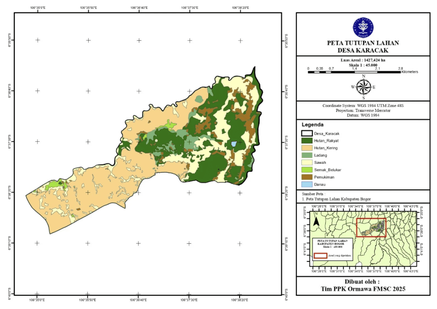 Secara spasial, Desa Karacak berada di Kabupaten Bogor dengan sistem koordinat WGS 1984 UTM Zone 48S. Keberagaman tutupan lahan ini mencerminkan potensi desa baik dalam sektor kehutanan, pertanian, maupun pemukiman masyarakat. Peta ini menjadi acuan penting dalam pengelolaan sumber daya alam, perencanaan tata ruang, serta pengembangan program pembangunan desa secara berkelanjutan.